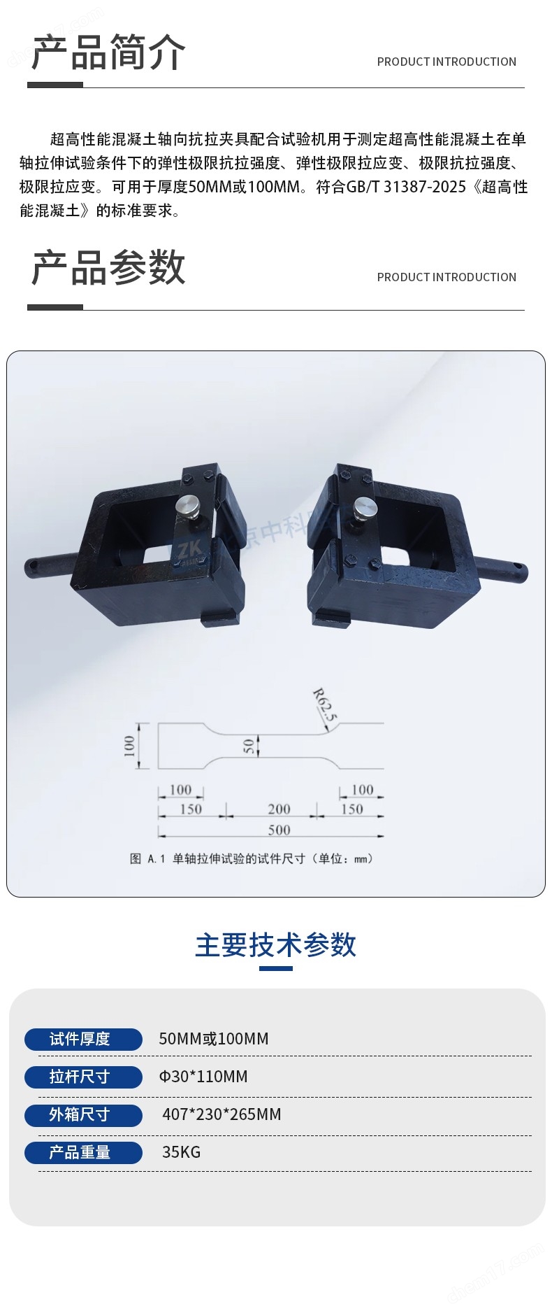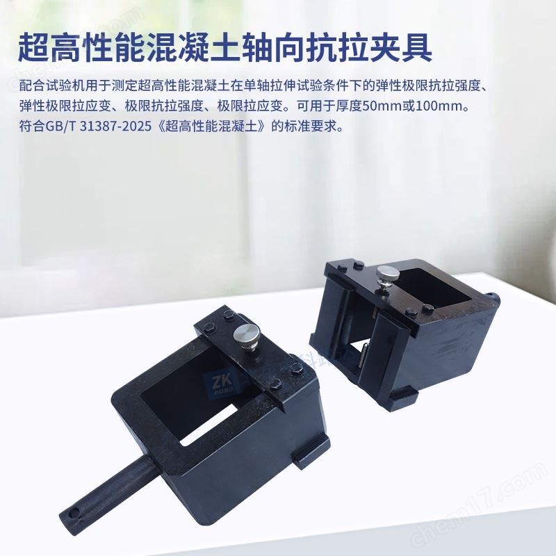 超高性能混凝土軸向抗拉夾具配合試驗(yàn)機(jī)用于測(cè)定超高性能混凝土在單軸拉伸試驗(yàn)條件下的彈性極限抗拉強(qiáng)度、彈性極限拉應(yīng)變、極限抗拉強(qiáng)度、極限拉應(yīng)變。可用于厚度50mm或100mm。符合GB/T 31387-2025《超高性能混凝土》的標(biāo)準(zhǔn)要求。